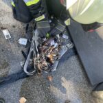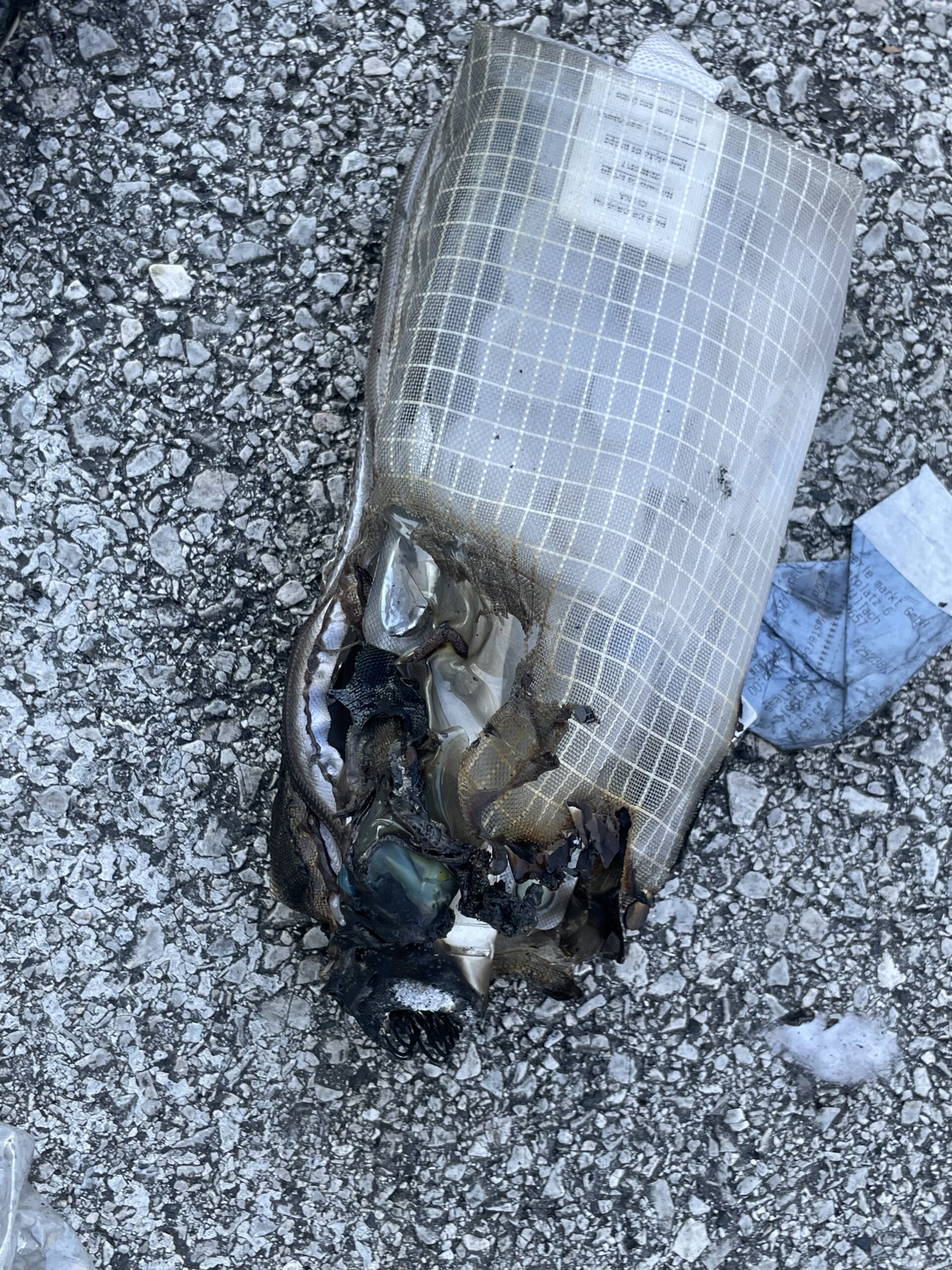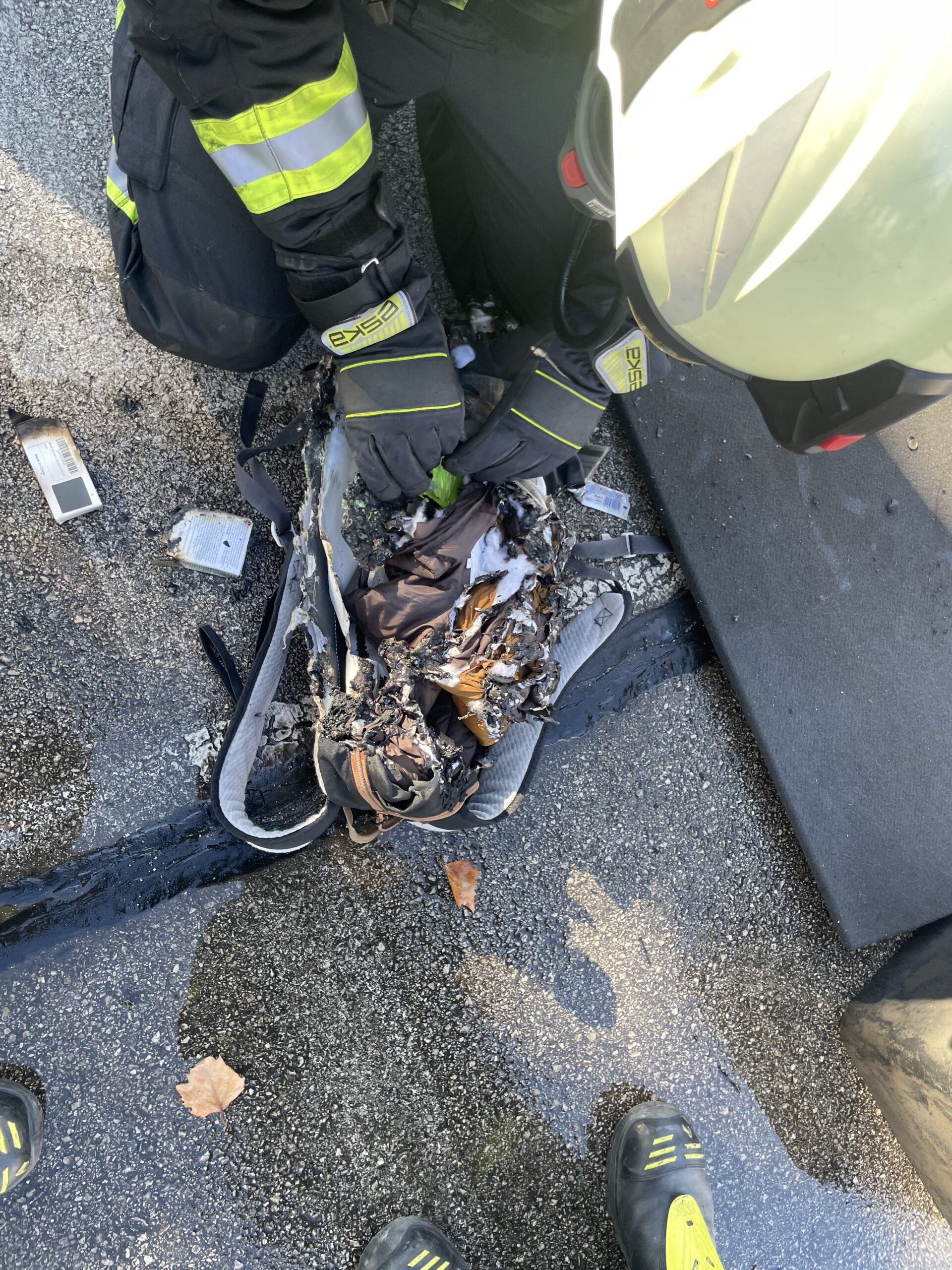 Nach Erkundung wurde der Entschluss gefasst, dass Fahrzeug ohne es zu öffnen mittels Rangierrollen ins Freie zu transportieren. Am Freigelände wurde das Fahrzeug mit der Funkfernbedienung unter Atemschutz und 3-fachem Brandschutz geöffnet. Beim Öffnen des Fahrzeugs drang dunkler Rauch aus dem Inneren. Nach genauer Untersuchung konnte der Kofferraum als Ausgangspunkt des Brandes lokalisiert werden. Im Kofferraum befindet sich ein stark verbrannter Rucksack; große Teile der Fahrzeugrückbank sind verbrannt. Der Rucksack wurde im Beisein der Polizei zerpflückt, dabei konnte eine elektrische Zahnbürste als Ausgang der Zündquelle ausfindig gemacht werden. Der Laptop wies nur geringe Brandspuren auf und zeigte auch keine Deformation im Bereich des Akkus.